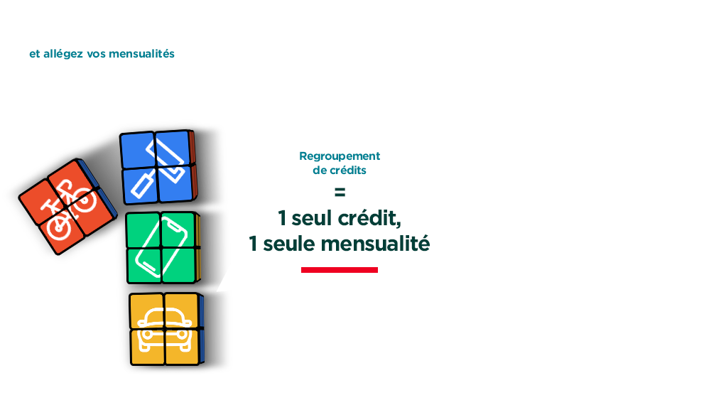 Le rachat de crédit vous permet de regrouper plusieurs crédits en cours (perso, travaux, auto) en une seule mensualité et de gagner en simplicité. Vos mensualités sont regroupées, vous n’avez plus qu’un seul emprunt et le montant de votre mensualité est plus allégé. Faites une simulation de rachat et réalisez votre nouveau projet !